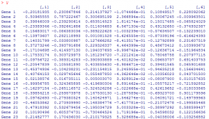 Our input data for today’s analysis consists of a large array with 100 rows (each representing a gene) and six columns (each representing an array measurement). First three columns of the array contain data from one condition (three replicates) and the last three columns contain three replicates of another condition. This website explains how you can create a table with random data for playing with limma.