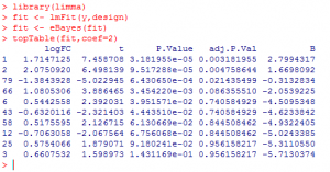 Let us first study the ‘limma’ package. We like this module the most, because it is useful for both array data and RNAseq data. It identifies ‘fold changes’ from a table of multi-array gene expressions.