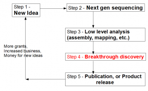 Let us view the entire loop (see figure above) from the viewpoint of a biologist. A biologist gets a novel idea (Step 1), and based on that, he contracts with a sequencing facility to sequence his samples. Sequencing center turns his sample into large library of A, T, G, Cs (Step 2). That sentence summarizes many complex steps, among which, sample preparation itself, can be quite challenging, especially for unusual experiments. Moreover, the efforts of sequencing facility are not straightforward by any means, because it has to keep abreast of changes in technologies, optimize protocols to get the highest throughput, get trained on latest protocols for unusual sequencing requests, upgrade software, and so on.