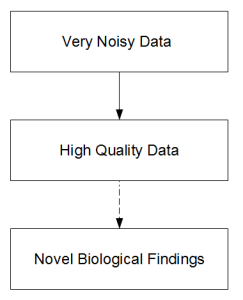 The progression from top block to second is an engineering problem, whereas the last part needs unusual insights and is therefore unpredictable. Publication of genome paper with focus of having the genome itself elevates an engineering problem to the status of a scientific discovery. Therefore all kinds of wrong questions tend to get asked. Quality of an engineering solution is judged by cost and achievement. So, if two groups claim to sequence the genome of giraffe, one that does it at 1/10th of cost of other with 1/3rd loss in quality probably did better. When the genome itself is deemed the scientific discovery, better quality at any cost is considered to be good.