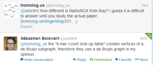 Yesterday, we noticed some activity on their website and a note about their about- to-be-published paper. So, we contacted professor James Yorke, the corresponding author, and he was kind enough to send us a preprint. Based on email correspondences, Dr. Yorke’s group designed the algorithm for very large genomes, such as the 22Gb conifer genome. So, they were pleasantly surprised, when the program performed well in the GAGE competition for tiny bacterial genomes.