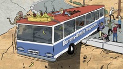 Each of the seven chapters starts with a beautiful cartoon picture showing Pevzner and Compeau solving problems in some kind of wild setting. They were drawn by Randall Christopher, a very talented artist based in San Diego, who also worked with Pevzner for his previous book. Here is his website. Even the design of those pictures show plenty of thinking going behind them. For example, in chapter 7, a monkey and Pevzner are rushing to get to a cart of bananas from the roof of a bus about to go off the cliff, while Compeau is barely holding the bus through a rope tied to a tree. Speed is very critical in recovering the bananas and in the subject matter of the chapter as well. The number plate of the bus is ANN-B$AA. Can you guess what its inverse BWT is?