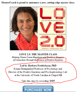 while Frederickson continues to offer her ‘science-backed’ Love 2.0 classes as “Kenan Distinguished Professor of Psychology and Director of the Positive Emotions and Psychophysiology Lab at the University of North Carolina at Chapel Hill” at a cost of $395/person ‘by recording’ !!!!