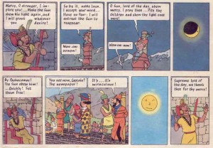In Titin episode Prisoners of the Sun, Incas were ready to burn Tintin and Haddock on wooden pyres, when a solar eclipse started. Incas were ignorant about the phenomenon of solar eclipse. So, Tintin convinced them that he was taking the sun God away and he could do many other harms, if Incas did not release him immediately.