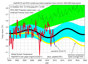Comment: the astronomical/harmonic model forecast since 2000 looks in good agreement with the data up to now, while the IPCC model projection has failed to predict steady temperature observed since 2000.
