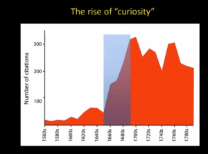 We started watching an interesting youtube video by Philip Ball on history of science, where he showed the trend in use of the word ‘curiosity’ to discuss how the scientific culture of Anglo-Saxon countries began in the mid-16th century.