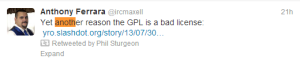 Getting back to the original tweet, here is the latest example of why GPL is not working for real programmers.