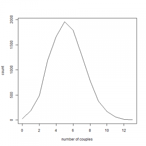 The above script (our elaborate pipeline) randomly picks 80 persons from a pool of 457*2. You can see the distribution of number of pairs in the following figure that is generated by running the script 10000 times.