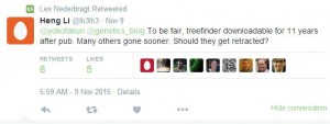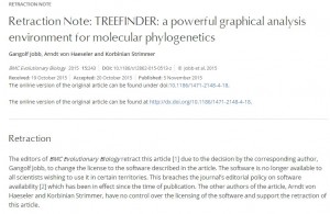 The above context should help in judging BMC’s claims for retracting the 2004 bioinformatics paper on Treefinder due to non-availability of the software. This claim of non-availability of bioinformatics software 11 years after publication has been found ridiculous by the bioinformatics community.