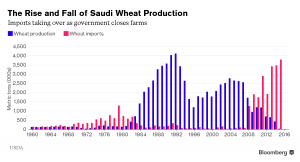 Despite torrid weather and virtually no rain, the worlds largest oil producer once grew so much of the grain that its exports could feed Kuwait, United Arab Emirates, Qatar, Bahrain, Oman and Yemen. The circular wheat farms, half a mile across with a central sprinkler system, spread across the desert in the 1980s and 1990s, visible in spring to anyone overflying the Arabian peninsula as green spots amid a dun sea of sand.