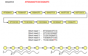 In the above figure, the de Bruijn graph has 11 nodes connected by edges. Let us assume that this very short ‘genome’ is sequenced by 10 nt short reads. Five such short reads are shown in the above figure, among which four are perfect, but the fifth has single nucleotide error (marked in red).