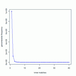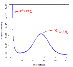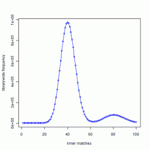 In the next figure, we show the K-mer distribution constructed from short read library of another genome that we are trying to assemble. This is real data from 100 nucleotide Solexa libraries (HiSEQ), not simulated data.