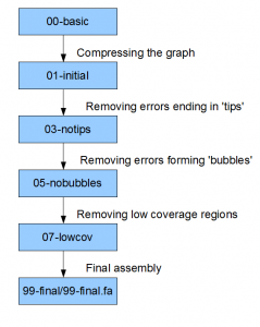 Unfortunately, most assemblers do these calculations in memory and give you the final result or intermediate results only at important junctures. That is understandable, because writing a large graph on the disk costs time. Contrail is the only exception in this regard. Contrail uses disk-based Hadoop, and not huge RAM, to assemble a genome. Therefore, it operates by writing an image of the graph at every step and then letting the next stage of map-reduce to take the graph as input and process it. This provides great opportunity for anyone to play with small examples and learn about various steps of the algorithm.