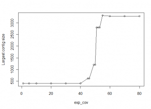 As you can see from the above figure, when exp_cov is low, Velvet has difficulty reassembling the original sequence. The largest contig assembled by Velvet is only 400 nucleotides long. As we increase the exp_cov, the size of largest contig gets bigger between exp_cov=50-60, which is indeed the coverage ratio for the reads in our library. For exp_cov above 60, the size of the largest assembled contig is close to the actual size of the original genomic sequence.