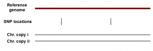 In the above figure, two SNPs can both be on chromosome copy i, both on copy ii, or one on i and one on ii. Assigning all SNPs to two different chromosomes is difficult, and the problem is even harder for NGS sequences.