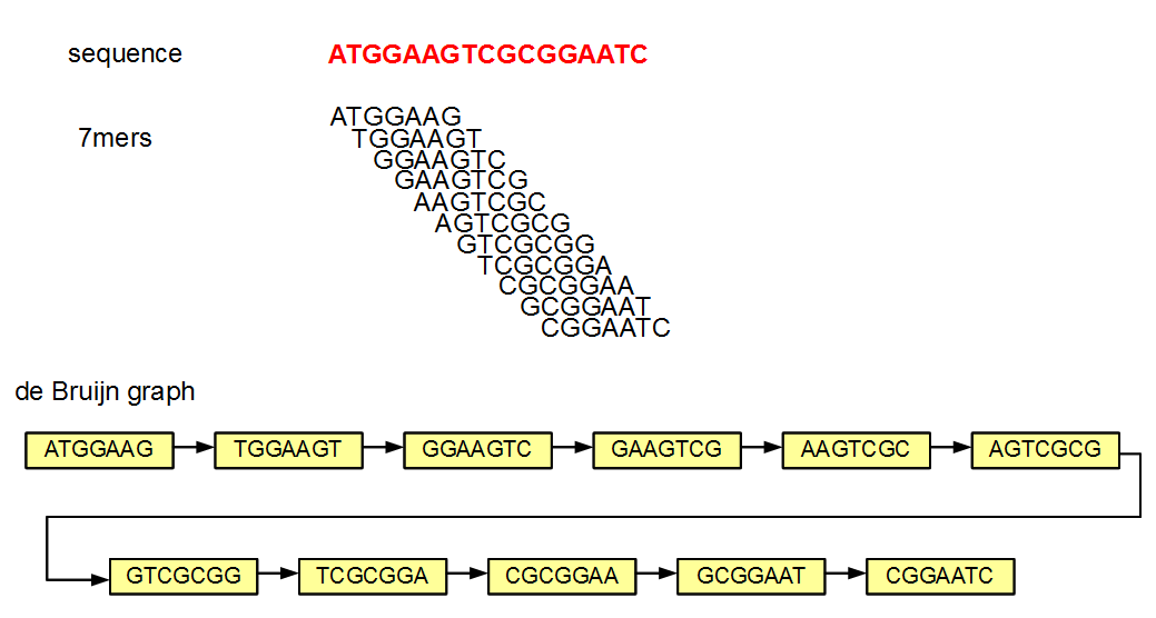 In the above figure of de Bruijn graph, each node and its neighbor differ by exactly one nucleotide. Let us say that you store the above de Bruijn graph in a hash. If you know that one node is TGGAAGT (second in the chain), you can query the hash by asking whether any of the four possible neighbors on the right side (GGAAGTA, GGAAGTC, GGAAGTG, GGAAGTT) and four possible neighbors on the left side (ATGGAAG, CTGGAAG, GTGGAAG, TTGGAAG) exist in the hash. If any of those neighbors exist, you know that they are linked in the graph, because de Bruijn graphs always link two nodes differing by exactly one nucleotide. So, you can essentially build the whole graph by knowing only the nodes or the k-mers.