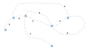 Rectangle graph algorithm starts, where Minia and Meraculous left. If a de Bruijn graph looks like the following figure, Minia focuses on finding out the nucleotide regions between the branching nodes, or the regions A,B,C,D,E,F,G,H. The question is what next?