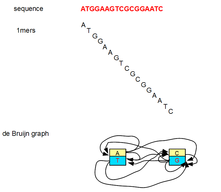 To conceptually grasp the significance of choosing the right k-mer, let us start with very small k-mers (1, 3, etc.) and increase the size. We showed the de Buijn graph for k=1 in our earliest commentary.