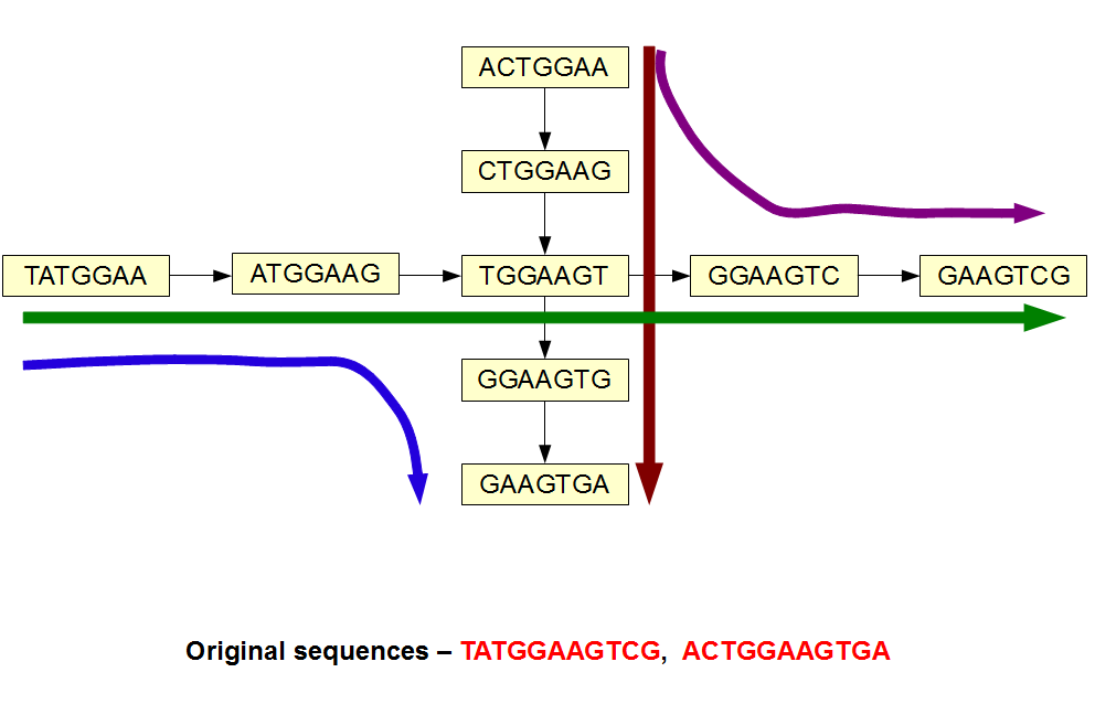 In the above image, the original sequences are shown at the bottom. The de Bruijn graph constructed with k=7 has a branching k-mer. So, it is possible to assemble the de Bruijn graph with 4 possible paths, even though the original reads had only two possibilities. So, two extra paths are artifacts of de Bruijn graph not supported by our reads. Those artifacts will go away, if we simply raise the k-mer size from 7 to 9. Two paths will separate away and we will get our original reads back.