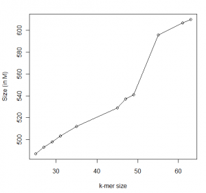 The above process is going on at many different nodes, when we increased k-mer from 25 to 63 in the example of ~700 Mb genome presented earlier. Even when the increase of k from 61 to 63 is likely to resolve few ambiguities, although the overall N50 does not increase.