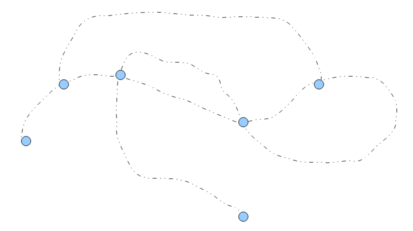 The above image shows part of a de Bruijn graph for a genome. The black dotted lines consist of many k-mers, but each k-mer has only one left neighbor and one right neighbor. Those parts of de Bruijn graph are each to combine (assemble). On the other hand, at each branching node (blue circle), the program needs to make a decision about which path to take. The assembled sequence differs based on which way the algorithm picks.
