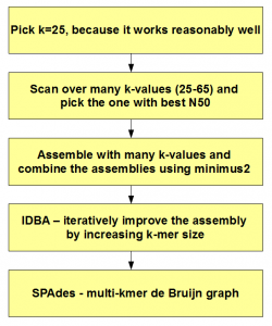 What is the solution? In the Jurassic age of NGS analysis, researchers ran Velvet for all possible k-mers and picked the assembly with best N50. That is suboptimal, as we explain below.