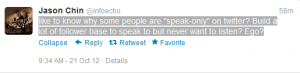 Internet is a completely anarchic medium of exchange, and so we expect to see all types of Twitter feeds, ranging from ‘very chatty’ to ‘speak only’. That does not bother us, and the amazing thing about internet tools like Twitter is that they can bring such wide range of people together to communicate.