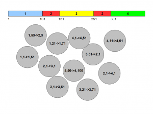 Let us try one strategy, where we start picking pairs of positions 50 nucleotide apart and form circles. In most cases, both ends of pairs will fall on the same colored segments, but in some cases, they will be fall on different segments. We also know that ‘1,1->1,51’ will be followed by ‘1,2->1,52’ and so on. So, we have some way of connecting the pieces in a long chain, but there are too many circles.