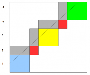A better strategy is to create small rectangles with two edges being formed by two segments of the genome. Those two segments can be the same, in which case, the rectangle is a square. We also draw a line that represents nucleotides 50 bases apart. Essentially, we have the same problem represented with fewer pieces.