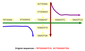 Construction of de Bruijn graph leads to loss of information as shown in the following figure. The original reads cannot be derived from the graph structure, because two spurious paths are generated. Increasing k-mer size is one way to resolve those spurious paths, but increasing k-mer size leads to insufficient coverage in other genomic regions.
