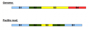 A picture will make this point clear. Here we show a genomic region and a possible PacBio read from the same genomic region -