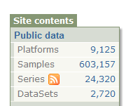 For non-users, let me first explain the structure of GEO. If you go to GEO website, you will notice the following stats on the right-hand corner near the top. They show the current contents of the GEO database.