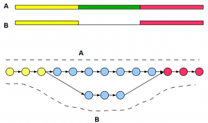 Let us first construct a graph for two alternatively spliced transcripts A and B for a gene. The regions shown in yellow and red are transcribed in both isoforms, whereas the green region is present only in A.