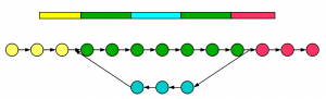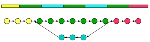 Next, we construct de Bruijn graph for repetitive segment of a genome. In the following figure, two green regions are identical and yellow, blue and red regions are all distinct.