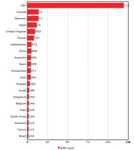 The first one shows the global distribution of reported transcriptomic datasets in NCBI GEO database. The number of measurements submitted by US- based researchers far exceed any other country. I do not know, whether some European researchers submit their data only to Arrayexpress (European database like GEO) creating some bias in the following chart.