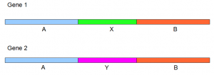 In the second simulation, 4000 reads were picked from Gene 2 and 2000 from Gene 1. Inchworm output reversed. We got (i) (i) the entire structure of Gene 2 except two nucleotides at the ends and (ii) the middle 1KB (1047 nucleotides) of Gene 1. In terms of the above figure, one inchworm output consists of A+Y+B from Gene 2, and the other inchworm output consists of only X.