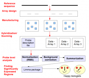 If you never did custom oligonucleotide array experiment, here is the entire pipeline. Top half shows what is done before hybridization. After hybridization and scanning, you will have one probe description file describing probe locations and several data files from each array. R packages such as limma, oligo and affy take those files as input and give you back the expressed regions.