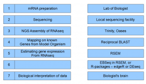 A collaborator asked us questions about various steps of a transcriptome (RNAseq) experiment. For everyone’s benefit, here we are presenting the complete RNAseq pipeline with short comment on each step. Typical bioinformatics program used for each step is also mentioned. If you use something different, please feel free to mention in the comment section.