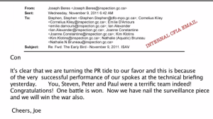 In summary, cheap technology itself is not panacea. The good, bad or no use depends on what the humans decide to do with it. In this case, the government agencies, likely captured by fish industry, are risking complete wipe out of wild salmon population to provide cover for their fish farms for a few months. While this researcher was trying to carefully investigate a serious disease outbreak, the government agency took it as a ‘PR battle’ and case for surveillance on the biologist, as the following internal email of the agency shows.