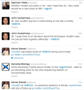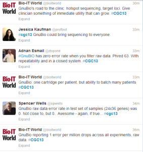 This new sequencing platform, announced at #CGC13 conference, is today’s hottest story at twitter. The development approach appears to be a follow-up of Moleculo theme, where hardware technology and nice informatics are combined to achieve what they are looking for (low-cost small-volume instrument for clinicians). Check #CGC13 hashtag at twitter for more details. Also OmicsOmicsblog wrote on the implications of Roche+PacBio deal, where the author mentioned gnubio as a wildcard.
