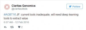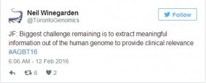 You notice the same lack of scientific discoveries in another talk of the morning. It was the one from Anne Wojcicki of 23andme. Several tweets were made about finding association between genome sequence and those responding to spam emails (geez!), but no huge breakthroughs were reported.