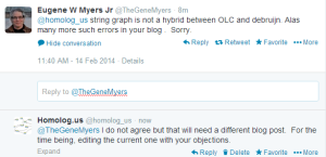 3. “in some sense, string graph is answer to assembly problem”. [Notes from Homolog.us - there is no conceptual difference between de Bruijn graph and string graph. So, we hope people stop putting those two approaches as polar extremes and start to combine them.]