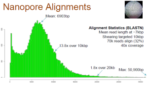 For reads that match, average accuracy is 64%. That number increases to 70% for the ‘2D base calling’ reads. These are much better than the initial report of Mikheyev/Tin and that is definitely good news. Moreover, another poster presentation at the conference reported similar numbers.