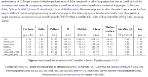 Where does GO Stand in the spectrum of languages and tools? The following benchmarking done by the backers of yet another concurrent language (Julia) explains. Please note that the benchmarks are biased toward numerical computing, where Julia excels. Moreover, the C, Fortran and Julia benchmarks were done using OpenBLAS, whereas GO was not. Still you can see the differences with python, Matlab and R. For a qualitative comparison of Julia and Go, please check the link at the bottom of the commentary.